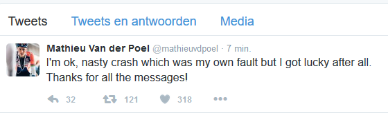 Na zijn zware val enkele uren geleden in Loenhout stelde zojuist Mathieu Van der Poel zijn fans gerust via twitter. 'Ik ben OK' tweet Mathieu. Hj heeft het ziekenhuis in Malle ook al verlaten weliswaar met een nekverband.