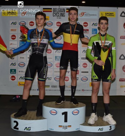 "Op dag drie van de Belgische baankampioenschappen stond voor ons nieuwelingen de scratch en sprint op het agenda. Als eerste moeten we een 200m rijden om de reeksen te bepalen, hier klok ik met 12,070 seconden de tweede tijd. Na dit begint het eigenlijke sprint tornooi, 16 renners plaatsen zich en alvorens je de finale mag rijden heb je in het beste geval 6 sprint heats in de benen ( voor mij zeven omdat ik in de kwart finale tegen Wannes Dewulf drie sprints nodig had om te bepalen wie door mocht). Tussen deze sprint heats zit dan ook nog een scratch, dertig ronden met één sprint, hierin pak ik mijn tweede zilveren medaille van dit BK. Later op de dag win ik ook de halve finale in het sprinttornooi en plaats ik me voor de grote finale om de driekleur, mijn tegenstander is Yoran Van Gucht. Ik vrees er een beetje voor want Yoran is echt snel. De eerste heat kan ik naar me toe trekken en heb nu het morele overwicht om de tweede sprint te betwisten, ook deze kan ik winnen en zo pak ik mijn tweede driekleur op een paar dagen tijd. We zijn super tevreden en zullen ons nog een keertje opladen om zondag er vol voor te gaan tijdens het BK omnium."