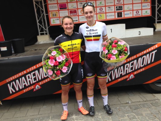 De nieuwelingen starten een ronde na de junioren, maar de jury misrekent zich wat waardoor het tijdsverschil van bij de start 2’45” bedraagt. Dat blijkt wel wat van het goede teveel, zeker op een vlakke en bochtenrijke omloop. De nieuwelingen hebben dit snel door en houden de snelheid hoog, de kloof schommelt wel elke ronde, maar komt nooit lager dan 2’15”. De junioren proberen nu en dan wel de gang er in te krijgen maar zij weten dat een kloof van meer dan 2’ niet zomaar kan gedicht worden en er is daarenboven niet voldoende samenwerking. Bij het ingaan van de laatste ronde is het tijdsverschil terug opgelopen tot 2’45”. De nieuwelingen beseffen dat ze gewonnen spel hebben en verlagen het tempo om hun sprint voor te bereiden. Dergelijke aankomst is een kolfje naar de hand van Belgisch kampioene Marith Vanhove die met duidelijk verschil Lani Wittevrongel en Jade Linthoudt achter zich houdt.