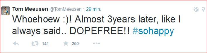 De Belgische Wielerbond KBWB legt Tom Meeusen geen schorsing op en gaat vrijuit. Tom riskeerde twee jaar schorsing wegens een inbreuk op de dopingregels. Volgens de voorzitter van de disciplinaire commissie van de wielerbond zijn er onvoldoende bewijzen om dopinggebruik door Meeusen hard te maken.