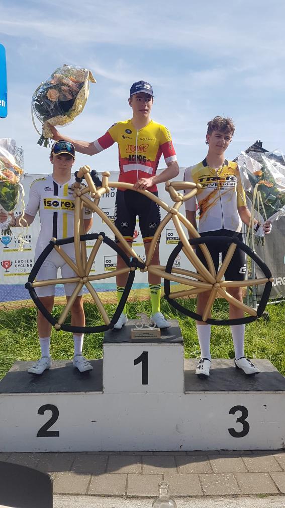 "Het was een koers op een vrij heuvelachtig parcours met toch wel een stevig windje. Halfweg koers was er een ontsnapping met 5. Wat later val ik aan en blijven we met 3 over. In de sprint kon ik Mauro Keppens nipt verslaan.": vertelt Jinze.