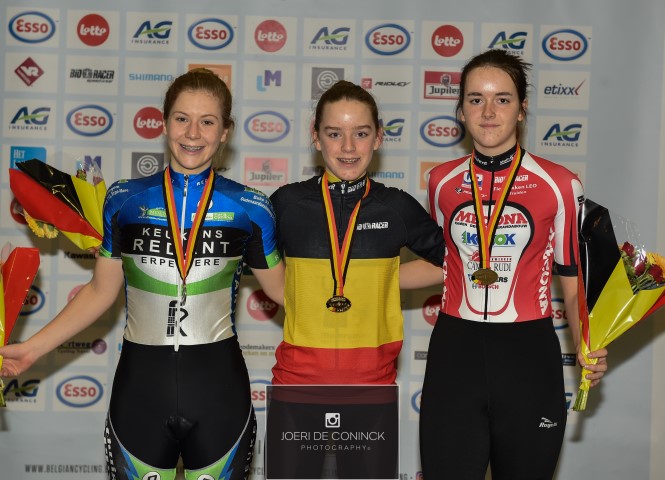 De puntenkoers over 60 ronden is dan nog alles bepalend want er zijn veel punten te rapen. De eerste sprint gaat naar De Rocker die zo op 5 punten van brons komt, de tweede gaat naar Renders die zo dichter bij De Clercq sluipt. Dan acht Esmée Gielkens haar moment gekomen, en zet een solo in. Zij staat dan op 88 punten, de 2 hoofdacteurs reageren niet want geen gevaar voor hen en tussen de rensters die voor brons strijden komt er geen samenwerking tot stand. Gielkens pakt zo eerst de 5 punten van sprint 3 om haalt even later het peloton in en schrijft zo 20 bonuspunten bij waardoor ze met 113 punten resoluut naar de derde plaats oprukt. De Tongerse brak op 3 december nog haar sleutelbeen tijdens het Vlaams kampioenschap omnium en maakte op dit BK haar rentrée, dat is dan meteen een prestatie die kan tellen. In de vierde en vijfde sprint komt De Rocker terug tot 109 punten en houdt zo zicht op brons, De Clercq vergroot de kloof met Renders tot 9 punten en is daardoor bijna zeker van de titel. In de slotronden proberen enkele rensters nog een late uitval, maar als finaal De Clercq en Renders doorstomen moet de rest passen. De Clercq komt als eerste over de streep met in haar zog Renders en Gielkens, meteen ook de top-3 in volgorde. Door de 20 punten van haar bonusronde wint Gielkens naast het brons ook de puntenkoers. De Clercq won deze winter alle meetings in Gent en Roubaix en bekroont zo als eerstejaars nieuwelingen een mooi seizoen. Renders startte deze winter op de piste en mag zeker één van de revelaties genoemd worden, zij zal de volgende winter bij de junioren een te duchten tegenstander zijn.