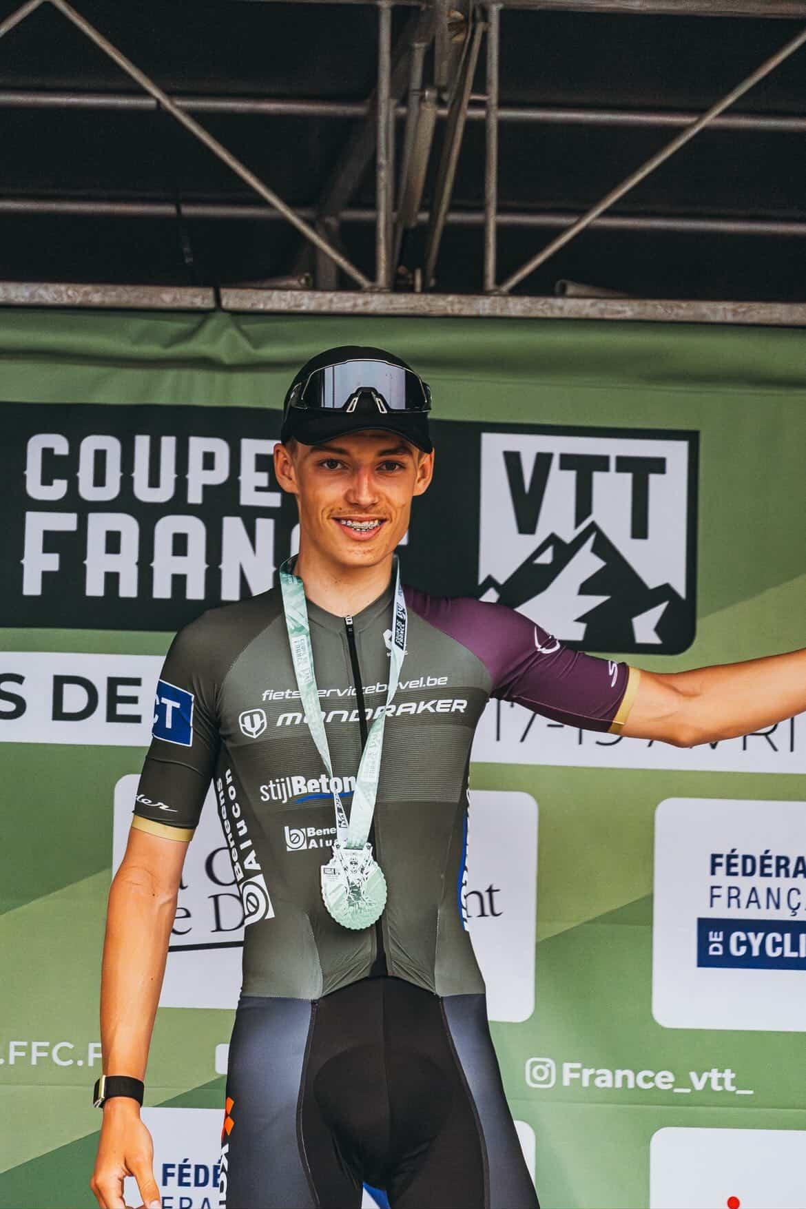 Lars Peers heeft de wedstrijd bij de nieuwelingen gewonnen in de Coupe de France MTB in Guéret. Peers reed een sterke koers en kwam met een voorsprong van twee minuten als eerste over de streep. Louis Denayer legde beslag op de tweede plaats. Maël Larruy vervolledigde het podium op dertig seconden van Denayer.