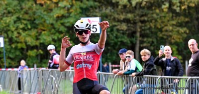 De twee jonge renners hielden elkaar in evenwicht tot een beslissend moment in het bosgedeelte. “Daar kon ik hem voorbijsteken en maakte hij een klein foutje. Zo had ik weer een gaatje van een tiental seconden,” legt Tielens uit. “Ik ben blijven doorrijden aan mijn tempo, waardoor Senne niet echt dichter kwam. Uiteindelijk had ik aan de finish nog vier seconden over.”