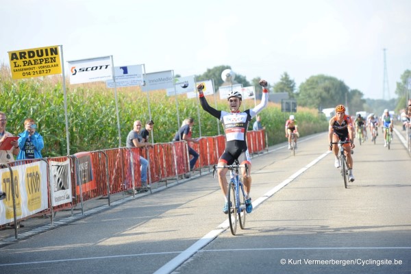 Al vrij vlug kregen we een leidersgroep in de wedstrijd van 13 renners waaronder 3 eerstejaars beloften Stijn Caluwe, Pieter Van Roosbroeck en Elias Van Hecke. Verder in de kopgroep Kevin Cant, Hendrik Sweeck, Jelle Brackman, Wouter Goosen, Adam Toupalik, Jan Denuwelaere, Stijn Huys, Bart Hofman, Patrick Gaudy en Daan Hoeyberghs. Er waren enkele pogingen van Daan en Jan om alles uit elkaar te rijden maar tevergeefs. Uiteindelijk kwam het tot een spurt waar de winnaar van zondag, Daan Hoeyberghs zich opnieuw het sterkste toonde. Jan Denuwelaere werd 2e en Elias Van Hecke werd derde. Nog een vermelding waard zijn de 2 eerstejaars beloften, Stijn Caluwe en Elias Van Hecke, zij waren de enige vandaag op 300 vertrekkers in alle categorieën welke het aandurfden om over de balken te springen!