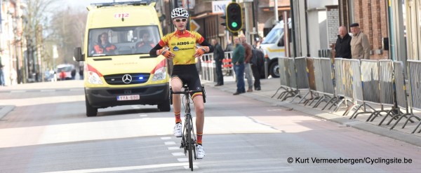Aan de start ook hier 2 kampioenen met name de Antwerps kampioen Jarne Van Dyck en de Belgisch kampioen Brent Machiels. Na enkele ronden viel de wedstrijd eigenlijk al in een definitieve plooi wanneer de Antwerps kampioen er solo vandoor ging. Zijn ploegmaten in het peloton leverde uitstekend werk en met Jarne zijn tijdritcapaciteiten was de vogel echt gaan vliegen. In de laatste ronde had hij het peloton bijna gedubbeld. Jarne werd uiteindelijk de verdiende winnaar met een voorsprong van meer dan 3 minuten. In het peloton moesten we dus op zoek naar plek 2 en 3. In de spurt welke hiervoor van ver werd ingezet begon de Belgisch kampioen een fout. Brent stak zijn armen de lucht in nadat hij rechts van zich had gekeken en zag dat hij onbedreigd was. Echter had hij niet opgemerkt dat links van hem nog Yannick Vos reed en over hem kwam en 2e werd. Brent werd 3e. Beste meisje werd Dina Scavone.