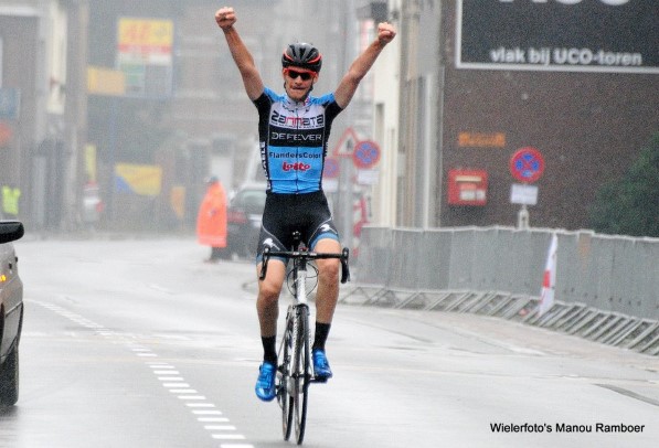 "Vandaag aan de start met 50 renners in Destelbergen op een vrij vlak parcours in regenachtige omstandigheden. Tot halfkoers bleef de wedstrijd vrij gesloten. Op 40 km van de eindstreep ging ik samen met Sven De Witte in de aanval. Sven voelde zich niet niet meer zo fris en ik besloot op ongeveer 25 km van de streep alleen door te gaan. Ik kon mijn voorsprong stelselmatig uitbouwen tot 1 minuut en was dan ook heel blij om eindelijk mijn eerste seizoenszege binnen te halen.": vertelt een dolblije Thibault Devoldere.