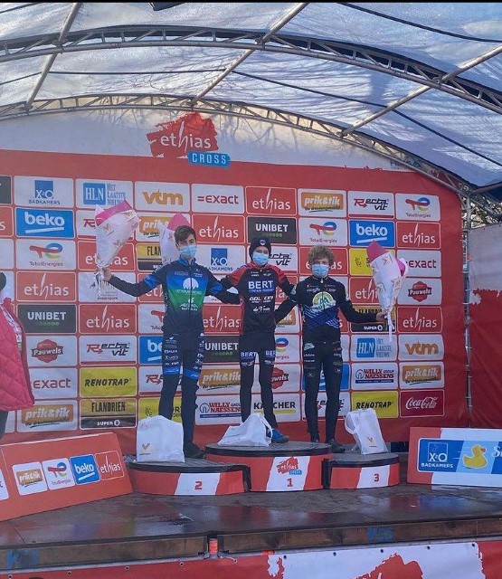 "Van bij de start ben ik met Yoren Vanhoudt er vandoor gegaan. We reden samen goed rond en we konden zo onze voorsprong veilig stellen. Onderweg speelden we een kat en muis spelletje met elkaar door afwisselend enkele prikken uit te delen. In de 3e ronde zat Yoren op kop in de grote zandbak en maakte ik een klein foutje en kwam ten val. Ik moest de achtervolging inzetten en kon in de laatste ronde opnieuw aansluiten bij hem. Opnieuw maakte ik een foutje en moest opnieuw in de achtervolging gaan. Opnieuw bij Yoren kunnen aansluiten en op kop beginnen rijden. In de sprint kon ik nipt de overwinning in de wacht slepen. Op deze manier bezorg ik mijzelf een mooi verjaarscadeau want gisteren vierde ik mijn 16e verjaardag.": vertelt Tibo.
